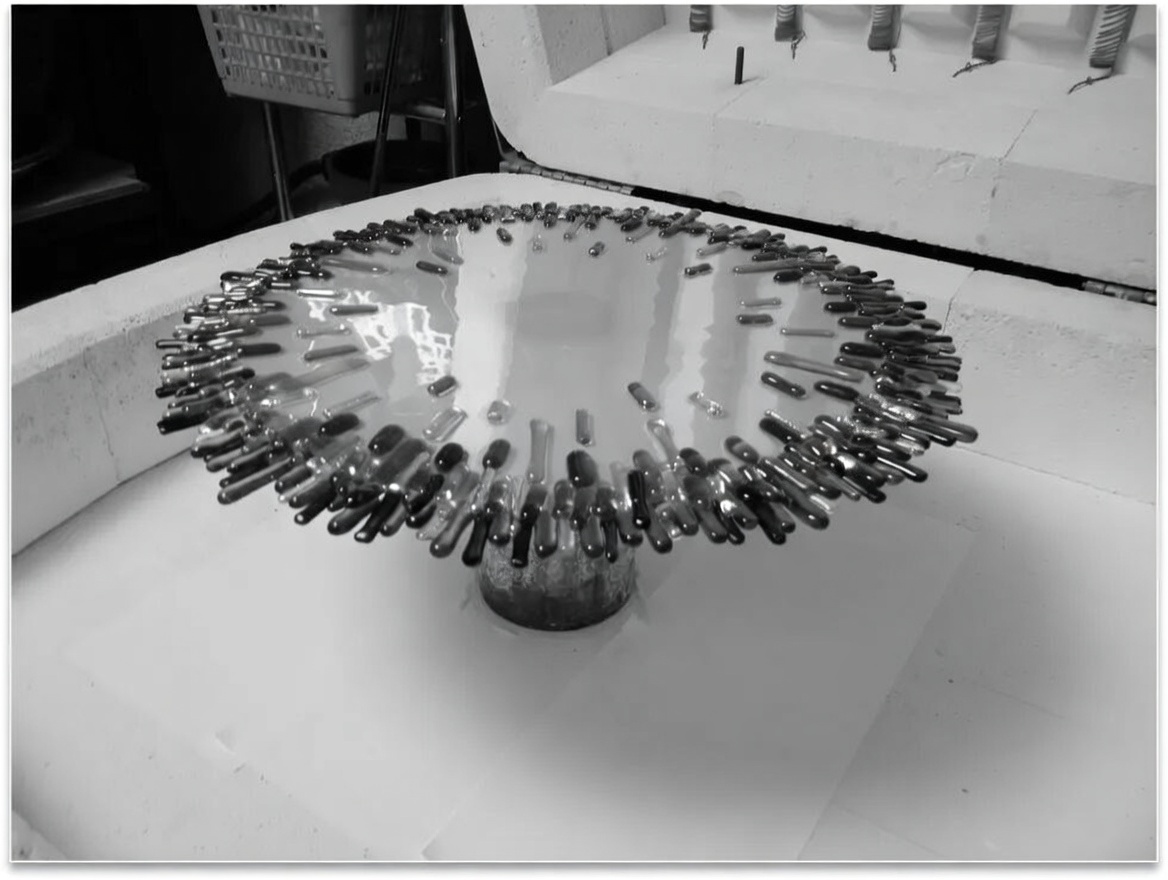 Le fusing est une technique ancestrale qui remonte à environ 3 500 ans et qui servait déjà à créer des objets en verre finement ouvragés. Le mot « fuse » signifie littéralement fondre, et c’est bien de cela qu’il s’agit : faire fondre du verre dans un four pour le modeler. À l’époque, cette méthode de travail au four était longue et exigeante, ce qui limitait fortement la taille des pièces réalisables. Elle connut ses premiers grands développements en Mésopotamie, avant d’atteindre son apogée sous la civilisation égyptienne antique. Au début de notre ère, le soufflage du verre supplanta progressivement cette technique. Le fusing réapparut en Europe vers 1870, puis connut un véritable renouveau à partir des années 1980, d’abord aux États-Unis, avant de se diffuser dans le monde entier. Parmi les artistes contemporains qui maîtrisent et subliment cette technique, on peut citer Narcissus Quagliata.